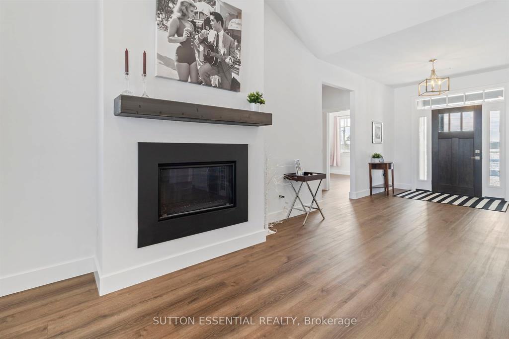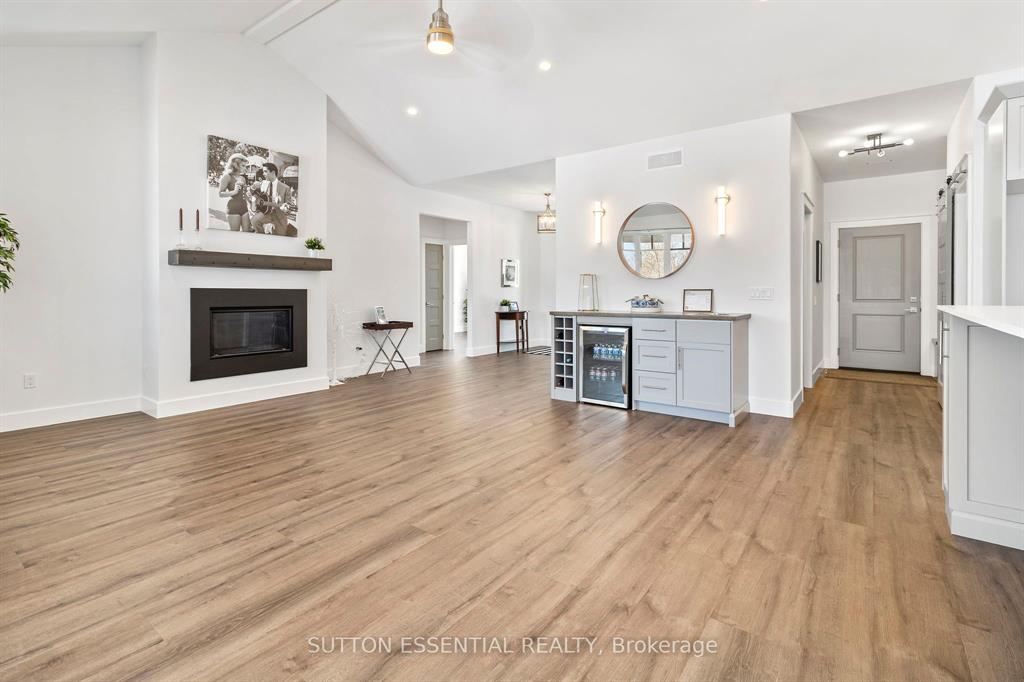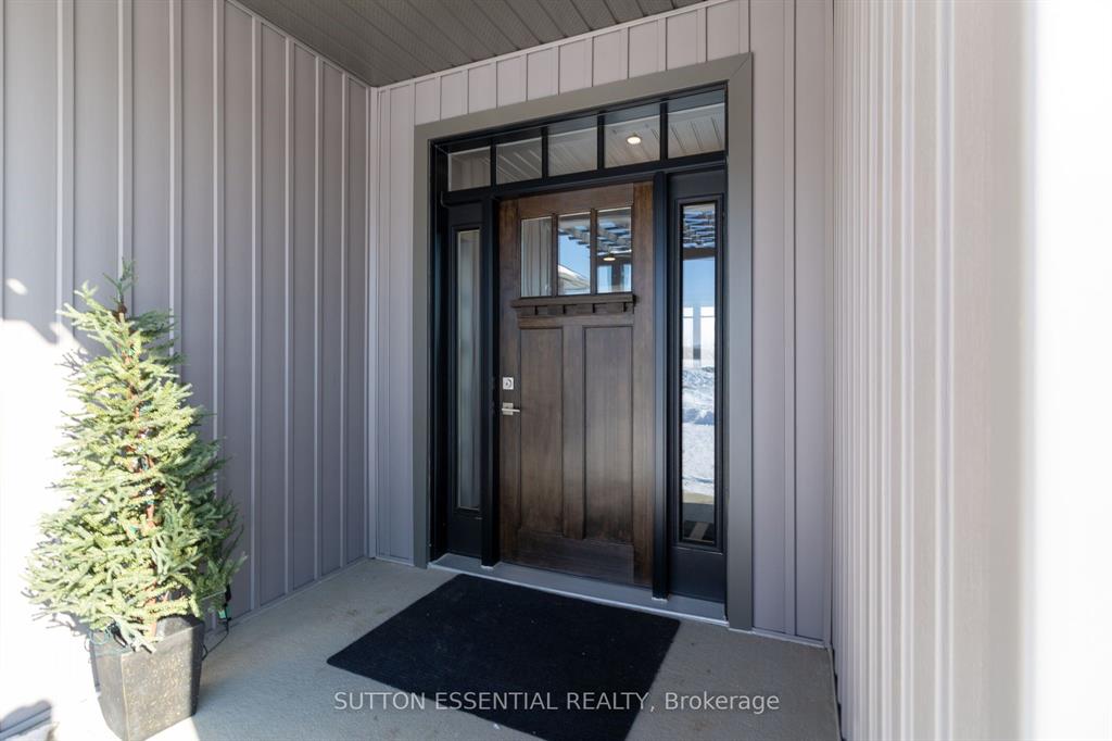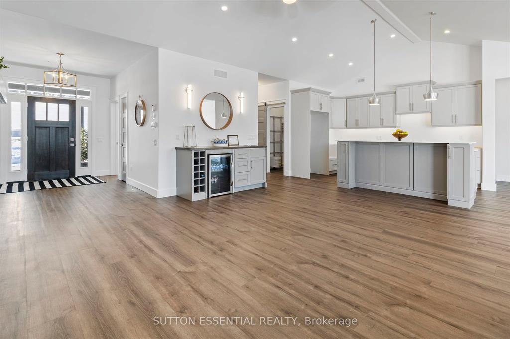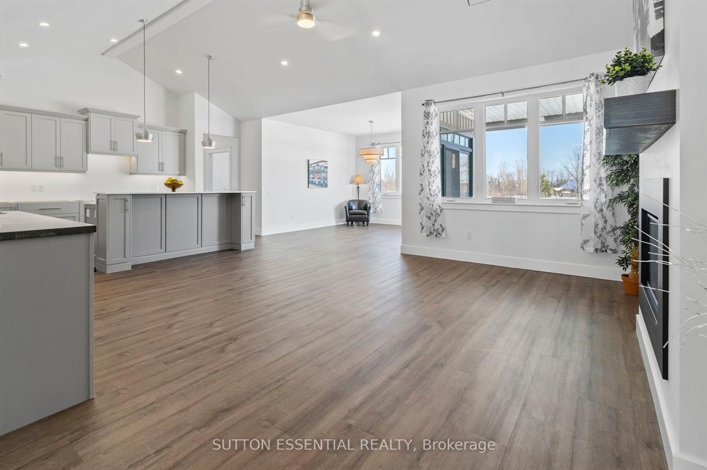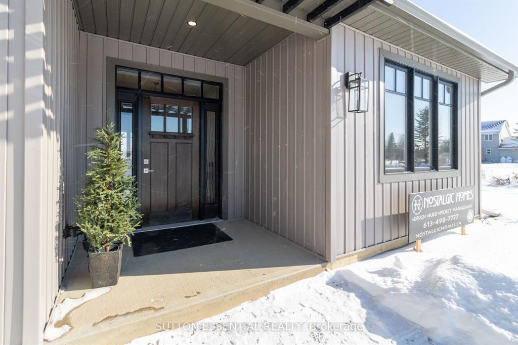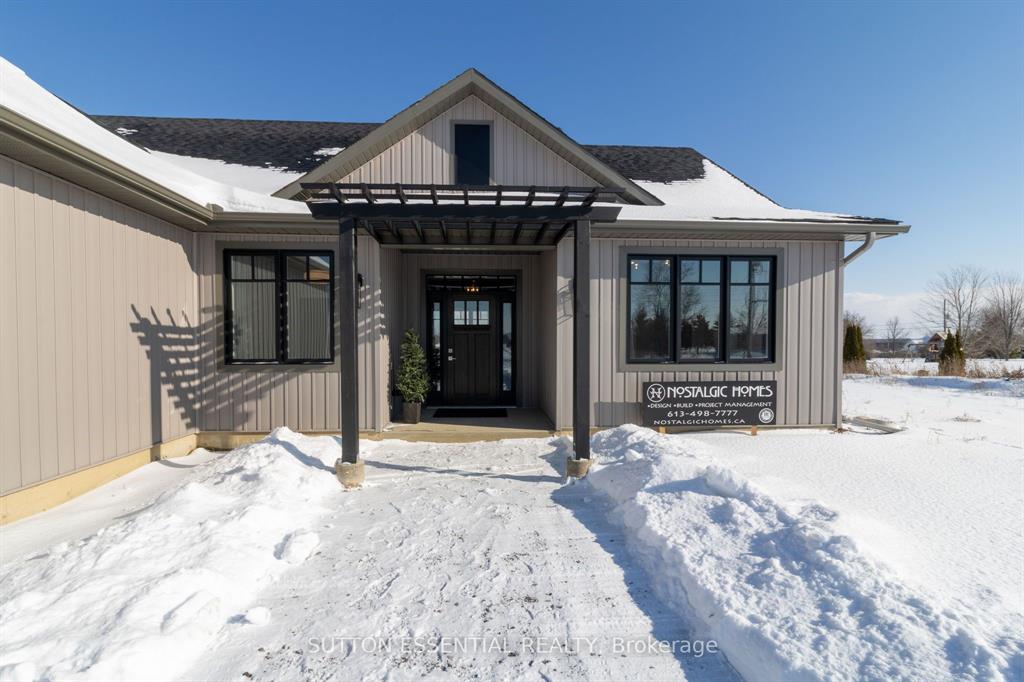 | Nearing Completion! Brand-new, custom-built bungalow by Nostalgic Homes, offering refined country living with over $60,000 in value-added standard features. This thoughtfully designed 3-bedroom + office, single-storey home provides over 1,920 sf of low-maintenance, high-comfort living on a peaceful one-acre cul-de-sac lot, backed by a full Tarion Warranty. This basement-free, low-threshold home is built on a fully insulated, heated slab with radiant in-floor heating beneath luxury vinyl flooring and central air conditioning for year-round comfort. Enjoy worry-free living with no sump pumps, sewage pumps, or damp basements. The exterior showcases timeless curb appeal with dark grey board-and-batten siding, black vinyl windows, a fibreglass Craftsman door, stained custom entry trellis, and two covered porches. Inside, soaring vaulted ceilings, quartz countertops throughout, and an open-concept layout elevate the living space. The kitchen is designed for both function and style, featuring a large island and custom cabinetry, ideal for everyday living and entertaining. The vaulted great room offers a cozy fireplace and a custom wet bar, perfect for hosting happy hour or relaxing with guests. The primary suite is a private rear of the home retreat, highlighted by a tray ceiling and decorative feature wall. The spa-inspired ensuite includes dual floating vanities, LED mirrors, soaker tub, a custom low-threshold tile shower, and a private water closet. Additional features include a covered rear porch and an oversized 2.5-car attached garage that is fully insulated, drywalled and painted, providing excellent storage and convenience. Located just minutes from Brockville and the 1000 Islands, with nearby parkland, athletic fields, and a quaint new general store and café. This exceptional home offers the perfect blend of modern luxury, thoughtful craftsmanship, and serene country living. Dare to compare this exceptional level of quality, design, and value. |
